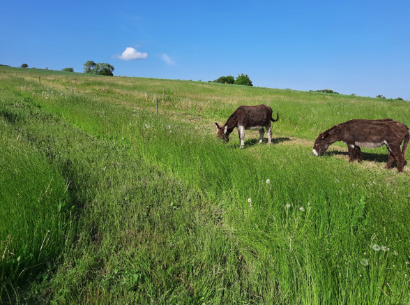 Figur 1. Areal nær kirkeuglerede som siden 2022 har fået lov at gro til med langt græs (levested for markmus og andre smågnavere, men også insekter) hvor der enten slås baner med lavt græs eller græsses ned af husdyr ved siden af. Partier med helt lavt græs er vigtigt da det gør det muligt for kirkeuglerne at finde og fange byttedyr på de åbne flader. Hegnspælene kan også bruges af kirkeuglerne som udsigtsposter. Da fotoet blev taget i juni 2022 var det lange græs fortsat under etablering. Foto: Peter Sunde, Aarhus Universitet