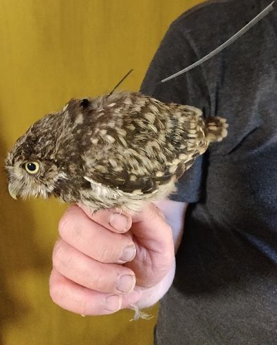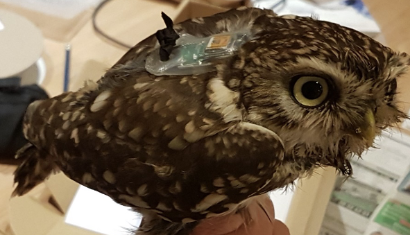 I 2019 GPS-mærkede vi ni kirkeugleunger kort før de fløj fra reden (Fig. 4) for at undersøge hvor godt de overlevede og ikke mindst hvordan og hvor langt de bevægede sig for at finde mager. Ud over en GPS-logger, indeholdt deres rygsæk også en radiosender som gjorde at vi kunne spore dem i landskabet og downloade de GPS-positioner som viste hvor de havde været i mellemtiden.