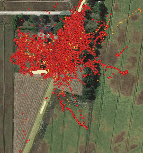Figur 3. GPS-positioner af en ynglende kirkeugle, registreret over tre nætter i 2022. Perlerækker af positioner viser kirkeuglens rute i perioder hvor der blev logget én position per sekund. Redekameraer optog samtidigt forældrene når de kom med bytte. Ved at kombinere redekameraoptagelser med GPS-positionerne vil det forhåbentligvis blive muligt at se præcise hvor kirkeuglerne fanger hvilke typer bytte, herunder i hvilken grad de bruger de arealer som forvaltes. Underlagsfotoet fra Googlemaps er taget mindst et år før kirkeuglen blev GPS-mærket. (Figur fra: Peter Sunde, Aarhus Universitet)