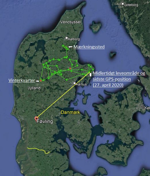 Figur 5. Spredningsruten for GPS-mærket ungfugl fra den fløj fra reden I Østhimmerland i sommeren 2019 til sidste GPS-position, 27. April 2020. I 2021 blev fuglen observeret som ynglefugl i Føvling i Sønderjylland.